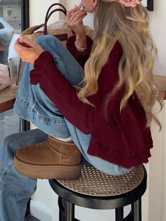 Elara | Cherry Red Ruffle Knit Cardigan
