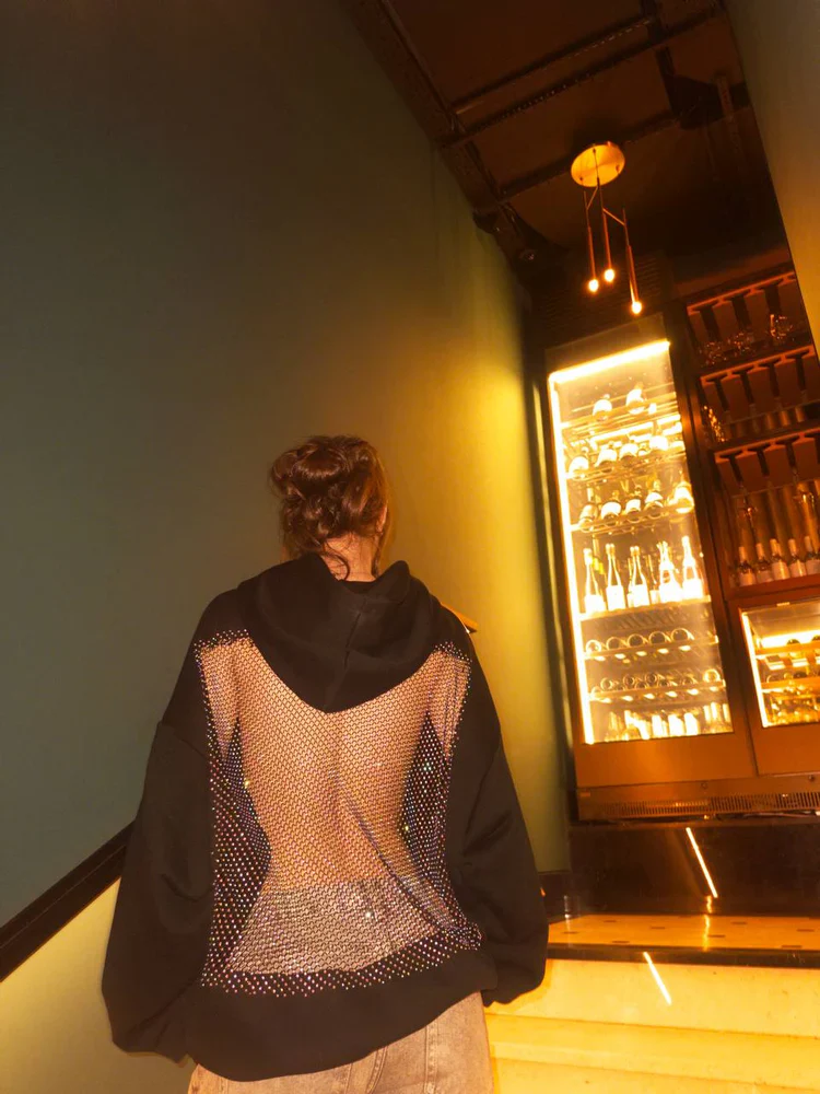 Ya sea que salgas a tomar algo, a caminar de noche o a reunirte con amigos, la sudadera con capucha de malla Mirage aporta un brillo suave y de alta moda a cada momento.